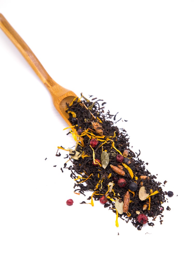 Чай черный индийский Ассам, почки сосны, плоды можжевельника, ягоды брусники, листья брусники, лепестки календулы, ароматизатор "Садовые травы"