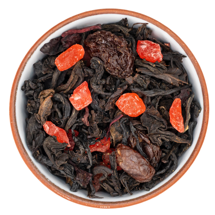 Состав Черный чай Ассам, каркаде, ананасовые кусочки, изюм, вишня, бамбуковый лист и ароматизатор. С настоящими ягодами! |