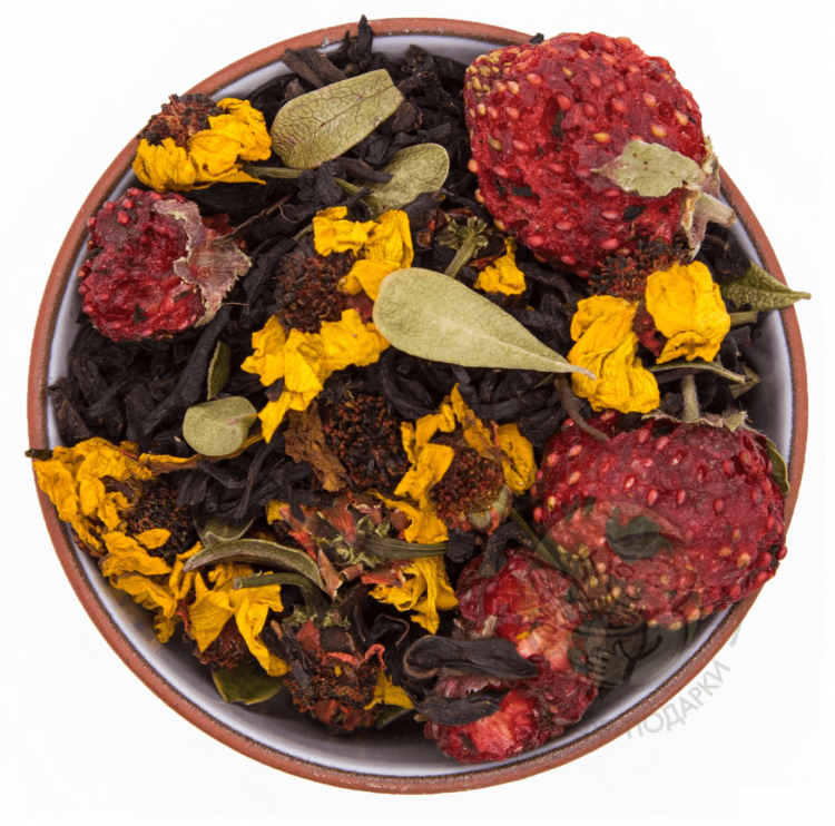 Чай черный среднелистовой, ягоды клубники, цветы хризантемы желтые, листья брусники, аромат "клубника со сливками