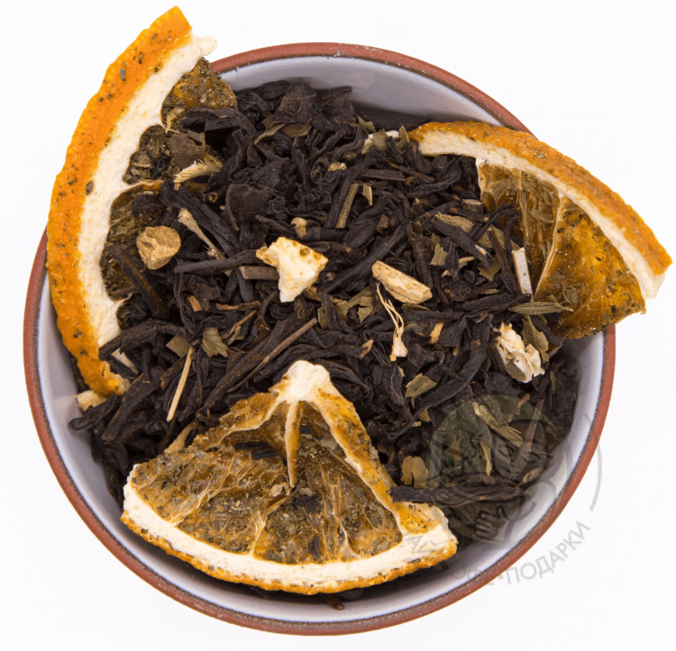Чай черный цейлонский высокогорный, кусочки имбиря, листья грецкого ореха, мята, дольки апельсина, кусочки апельсина с цедрой, аромат пряного красного апельсина.