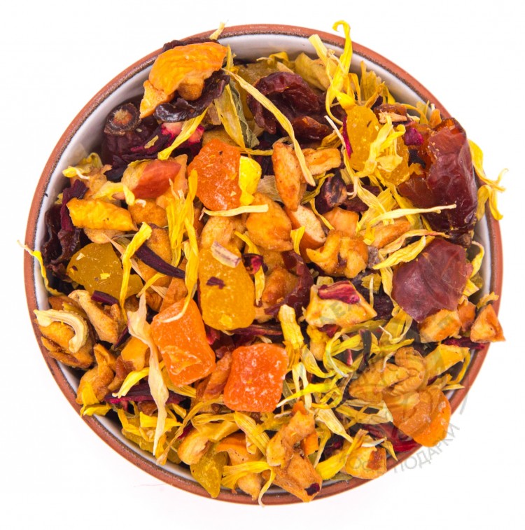 Каркаде, яблоки, кожура шиповника, папайя, лепестки календулы, аромамасла