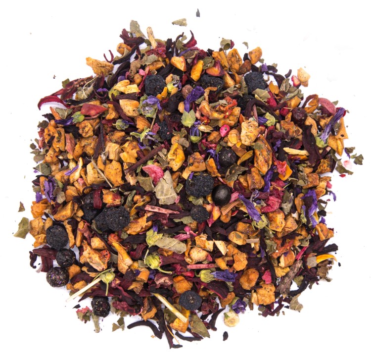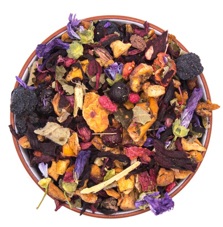 Сочетание каркаде, кусочков яблок, листьев ежевики, плодов аронии, листа грецкого ореха, цветов мальвы,ягод черники, кусочков клюквы, малины, клубники и нежного аромата малины и черники.